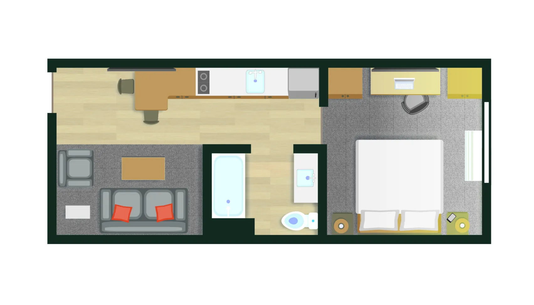 The living area flows seamlessly into a fully equipped kitchen, thoughtfully stocked with everything you need for a comfortable extended stay. Toward the back, you’ll find a private bathroom. Your bedroom, tucked away at the rear of the suite, offers a tranquil retreat with enhanced privacy thanks to a pocket door. Wind down in comfort as you enjoy your favorite late-night shows on a second 65-inch TV, complete with access to popular channels and your preferred streaming services.